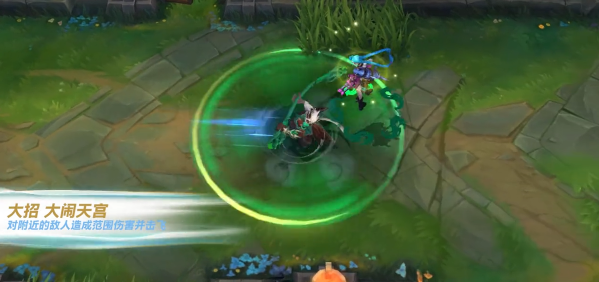 其次是各个技能的特效都有了很大的改进,除了被动印记变成龙形,一技能开启后整根玉龙棍都会发出耀眼光芒。其中最亮眼的当属大招,不仅棍影变成一片绿色,孙悟空周围还会出现大量云朵,颇有一种腾云驾雾的感觉。
