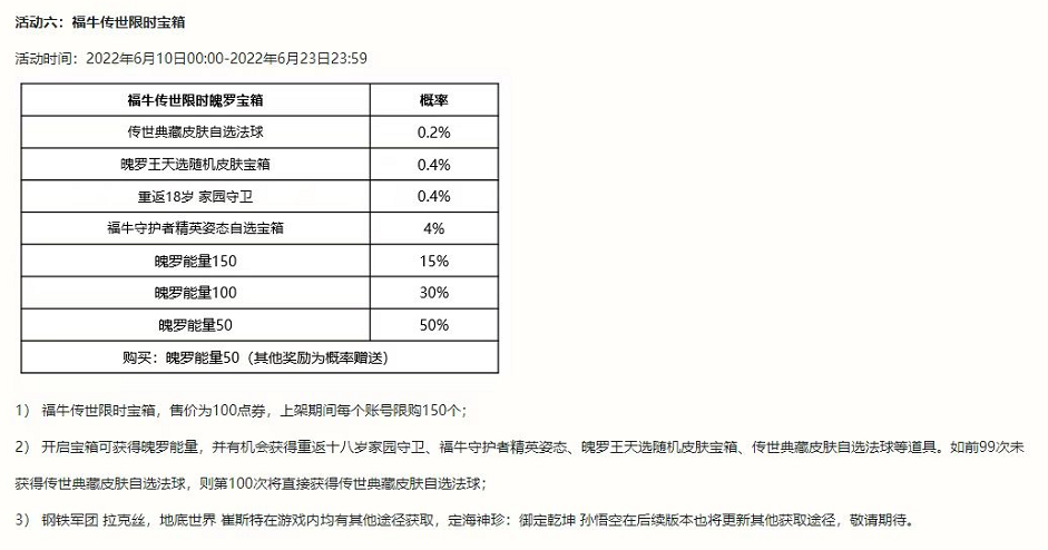 此次定海神珍:御定乾坤 孙悟空皮肤将作为奖励加入到全新的福牛传世限时魄罗宝箱中,该宝箱将于2022年6月10日00:00正式上架商城,售价100点券,限购150个。开启福牛传世限时魄罗宝箱,除了必定会获得50魄罗能量外,我们还有概率随机获得传世典藏皮肤自选法球、魄罗王天选随机皮肤宝箱、福牛守护者精英姿态自选宝箱、重返18岁拖尾或者魄罗能量的奖励。
