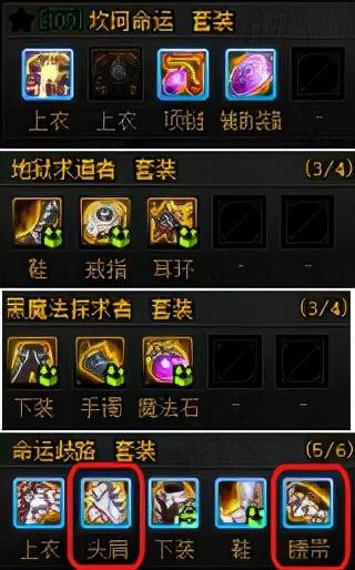 坎坷命运+地狱求道者+黑魔法探求者+命运歧路头肩和腰带套装。最强伤害爆发流套装,没别的优点,就是伤害高。适合几乎所有爆发流职业,毕竟伤害才是硬实力。注意暗抗需要81点才能完整发挥这套装备的伤害。