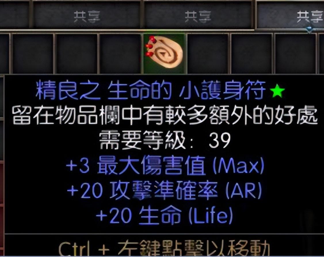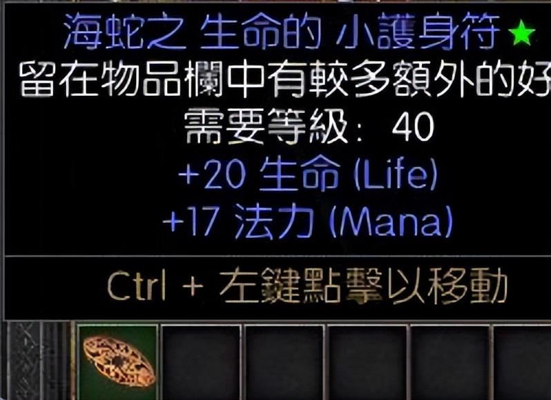 20法力,17生命的小型护身符。两条都是满变量,这件物品几乎是每个PK玩家必备的小护身符。这种满变的极品价格自然也不低,市场价大概在40元左右。