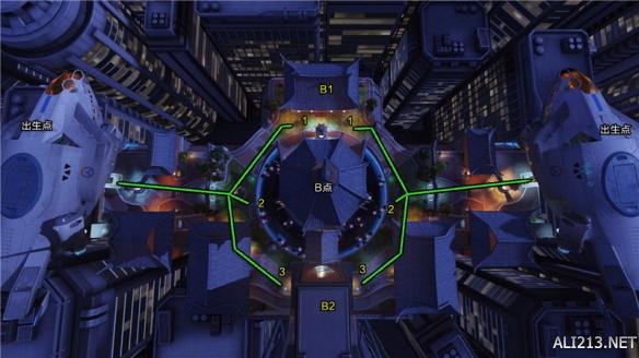 B2是位于一个通道的内部,其中有一个血包,埋伏在此可以打击从B点内部屏风另一侧涌过来的敌人,需提防被敌方线路3的进攻所消灭。
