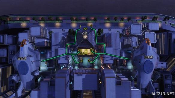 进攻线路有三条。线路1从A点上方绕路进攻。线路2从正面进攻,然后从A点的下方进入。线路三从右翼进攻,可配合线路2的队友推进。