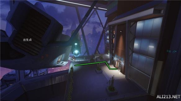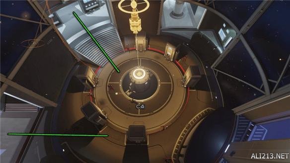 双方沿着图中所示绿色线条进入争夺C点。C点处在一个环形的房间内部,双方可以利用内部的设施作为掩体进行攻防战。最终拿下此点的一方即为本图漓江天塔的获胜方。