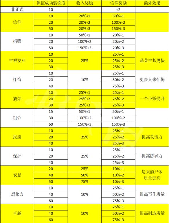 布道的基础收获是教堂评分÷5的信仰(四舍五入)和墓地评分×4的铜币。