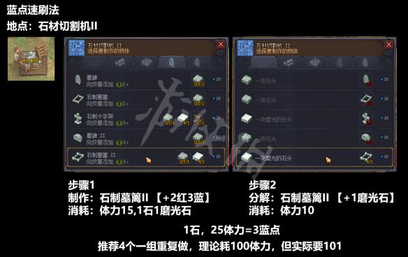 拥有石材切割机II后,造一个石制墓篱,需1石1磨光石,能够获得2红点3蓝点。然后降墓篱卖掉,会返还磨光石,也就是指消耗1石资源便获得了2红3蓝,4个一组来就算不吃东西一次也能加12蓝点,从此告别5银25蓝的坑爹书。