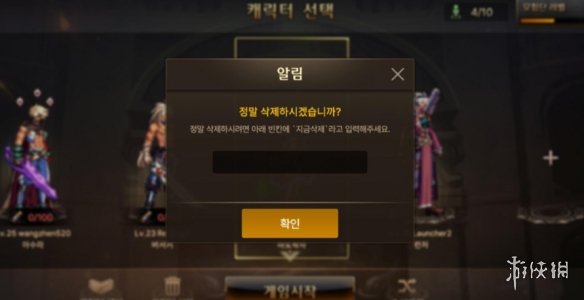在角色选择页面的左下角有个垃圾桶标志,选中角色惦记垃圾桶标志后就能删除角色,期间系统会弹出删除验证让你输入韩文的删除来确定删除。