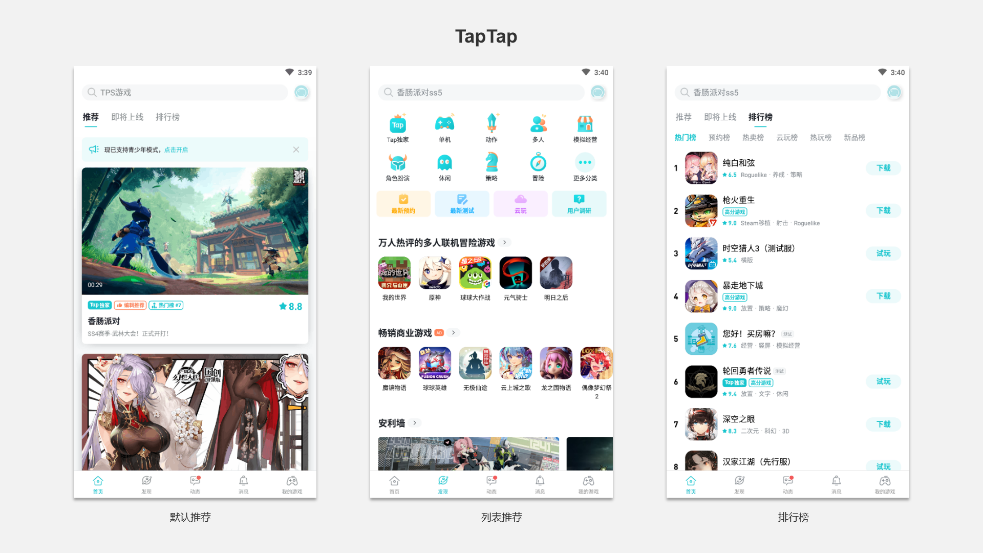 移动端的游戏平台推荐界面则有过明显的变化。由于移动端展示空间小,可容纳的信息有限,所以在默认推荐界面的设计上非常讲究。