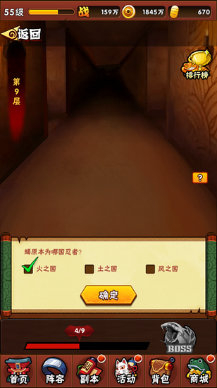 据点每一层都分为9关,每前进一步,都会遇到不同的情况,如直接获得宝箱、答题通关、击杀守卫等。答题回答正确可以领取宝箱,如果回答错误则需要进行战斗才可以获得宝箱,题目都来源于火影忍者原著,相信作为真爱粉的你一定不会答错。每一层的第9关是固定的守关BOSS,只有击败BOSS才能进入下一层。