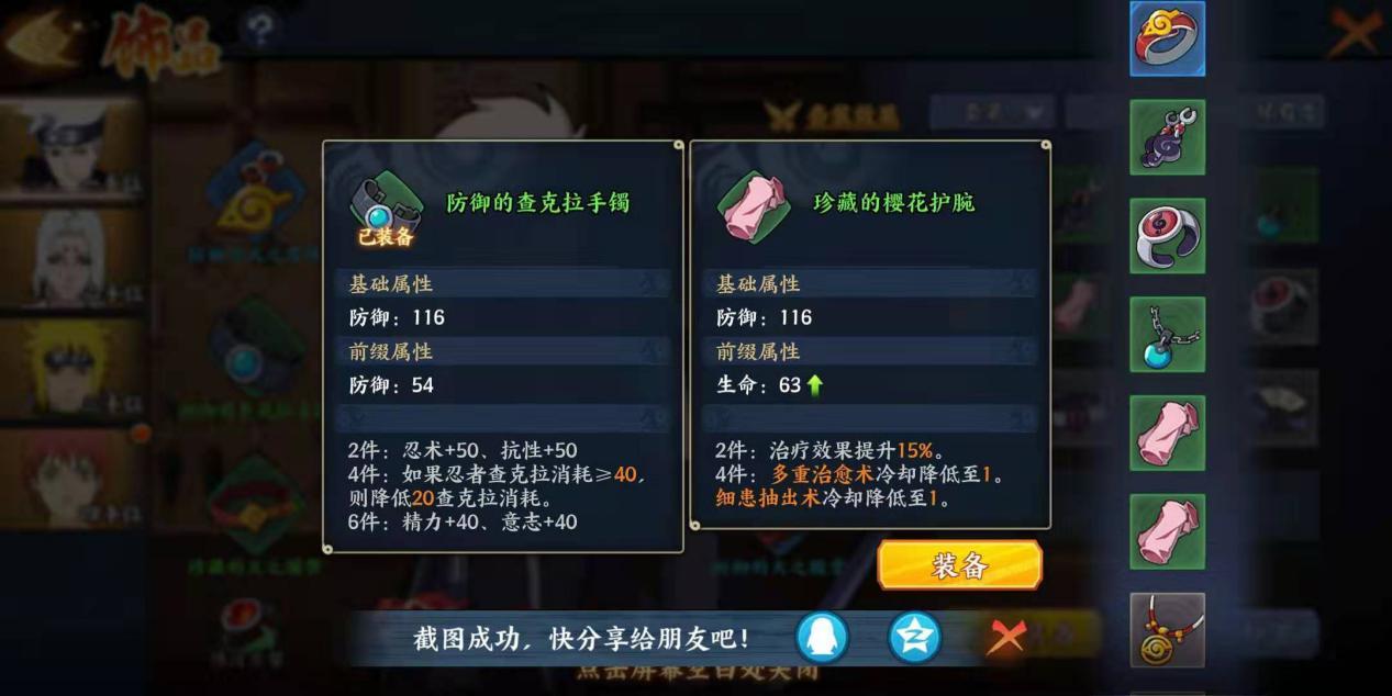 "樱花护腕"4件套则是针对小樱的,技能降低冷却时间,提升治疗效果;左侧的"查克拉"套装则是通用装,但实用性非常强,毕竟所有忍者共用查克拉发动技能,减少蓝耗对于部分忍者来说性价比很高,可以给阵容中其他忍者留出更多的发挥空间。
