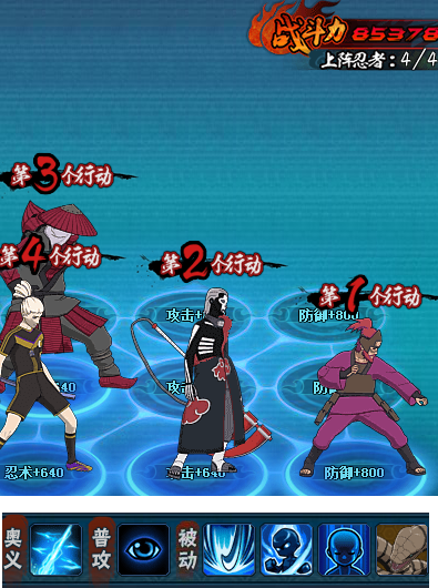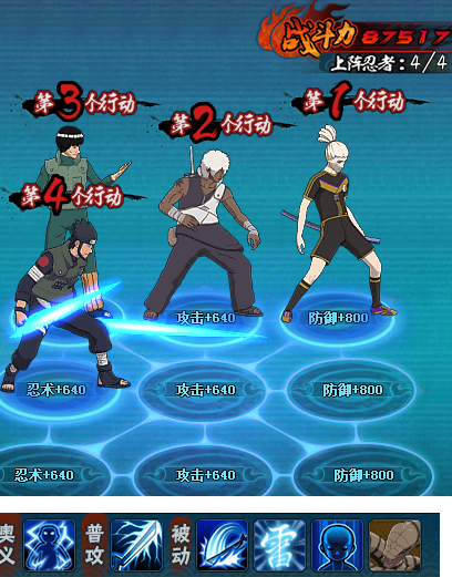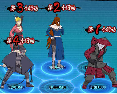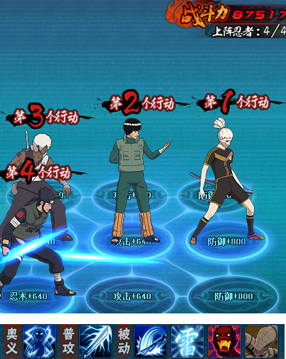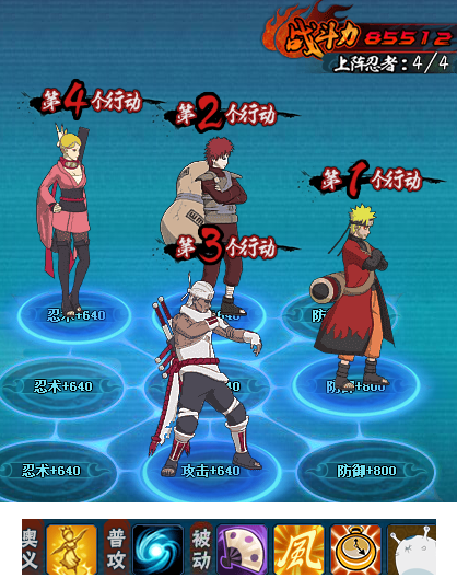 属性不够最好用阳动战法(加生命值),所有忍者要求心情为加生命值(奇拉比生命值为4个人里最低的一个)