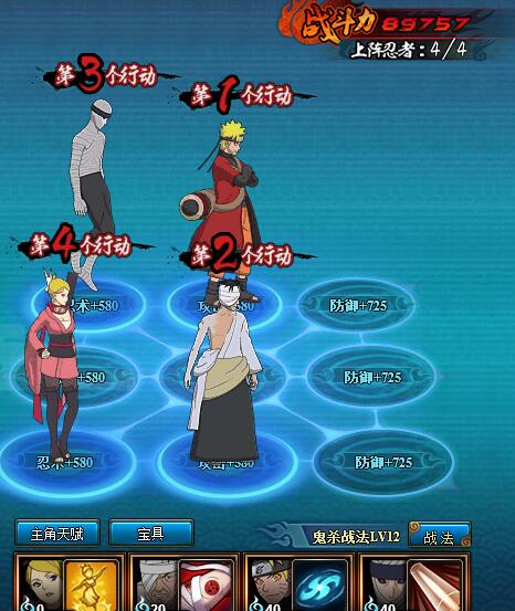 第二回合:仙鸣奥义自来也(注意连击后不能把自来也打死,如果你战力很高怕打死自来也可以选择仙鸣奥义蝎),无奥义,运气好出暴击的话角都自来也雷影全都会被吃掉,运气不好也至少能吃掉自来也,角都和雷影残血。风主刷新