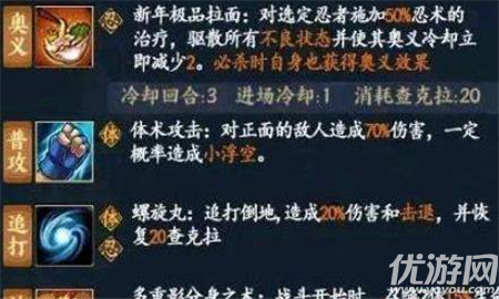 奥义:对选定忍者施加50%忍术的治疗,驱散所有不良状态并施加奥义冷却立即减少2。必杀时自身也获得奥义效果