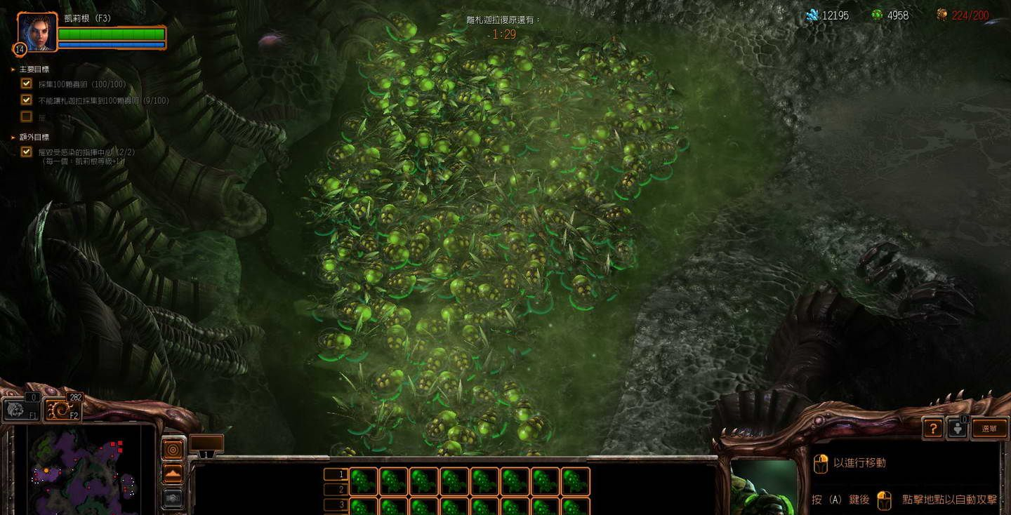 之后建议各位玩家集中收集地图左半部的虫卵。这些地区虫卵分布较多而且兵力比较脆弱 而额外的任务则是摧毁附近的人族感染基地,这样也没有太难;多产出一些自爆虫去炸掉就可以了 而具体的收集技巧还是小狗蟑螂同杂兵缠斗,凯瑞根在后面使用动能冲击来强杀伤敌人。 最后玩家收集足够多的蛋之后,与后面涌现的援军一起摧毁札加拉的基地即可结束本任务