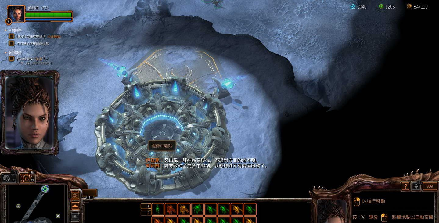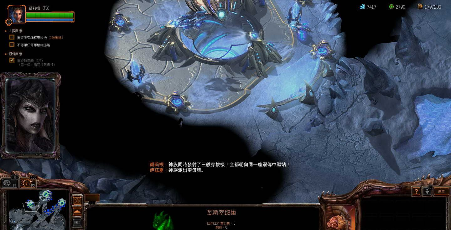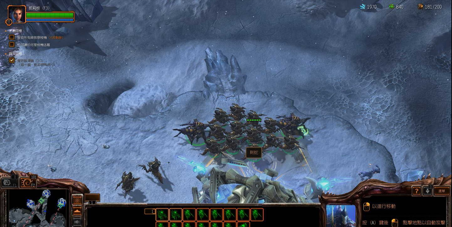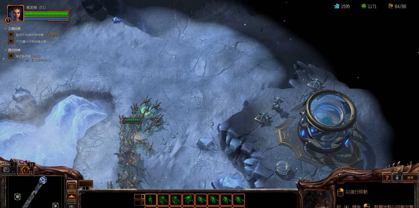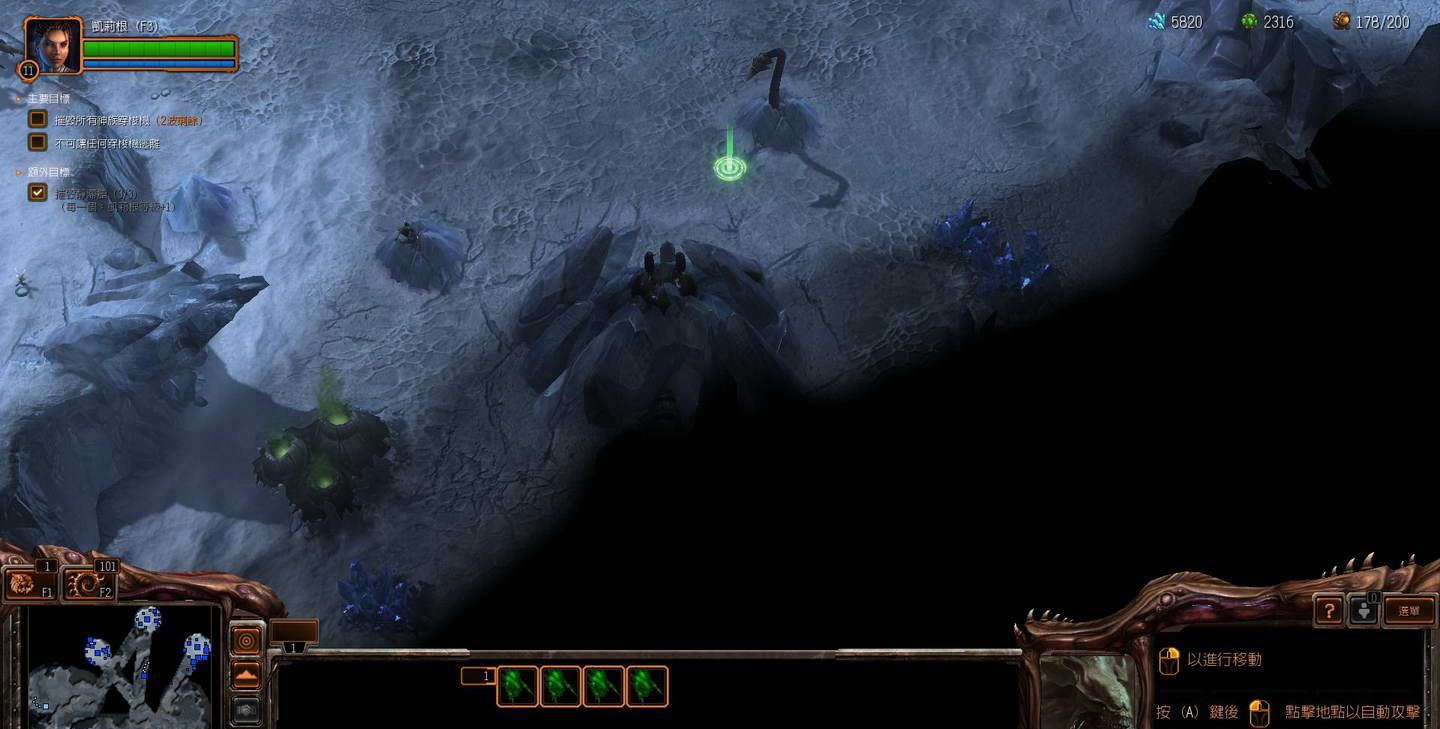 而玩家完成额外的支线,摧毁一些神族的静滞舱可以解锁附近被冰冻的刺蛇,从而增加你的部队实力 最后一波玩家将面对处于圣母舰保护下隐形的敌方信使部队,玩家需要摧毁圣母舰才能发现该信使部队 当然该主线任务也有另一种完成方法,那就是摧毁整个地图所有的神族信使起落基地。不过总体难度较大,完成是比较困难的