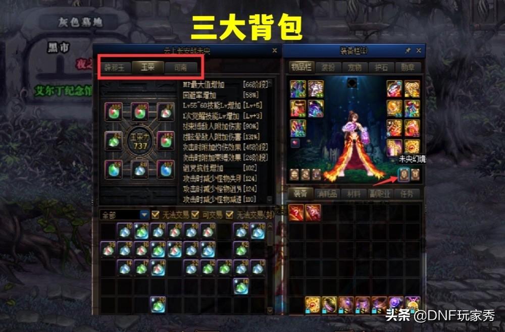 云上长安的材料,被专门装在了一个“未央宫”独立系统里,进入位置在“查看装备”按钮的左边,点击进入后,就可以看到三个背包:“辟邪玉背包、玉荣背包、司南背包”,每一个背包都固定100个格子,其中,辟邪玉和玉荣,是每个角色独有100个格子,而司南背包的100个格子,是账号共有。