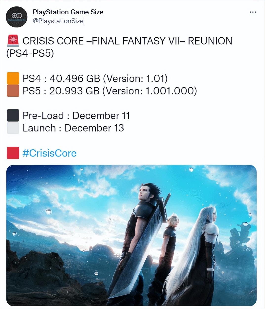 《最终幻想7:核心危机Reunion》发售在即,PS游戏数据博主PlaystationSize日前曝光了游戏PS版本容量以及预载日期。其中PS4版为40.496GB(版本: 1.01),PS5版为20.993GB(版本: 1.001.000),游戏将于12月11日开启预载。