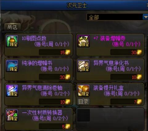 综上可以看出刷图点、装备提升礼盒和+7增幅券为必拿道具,其余可根据角色需求来选择。