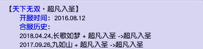 天下无双·超凡入圣开服于2016年8月12日,是一个玩家众多的三年以上新区之一。区内不仅新老玩家众多,还有数量较多散人玩家,所以日常任务环境较为不错,物价方面相对较低,各个组别均有非常出色的玩家,PK氛围相对浓厚。