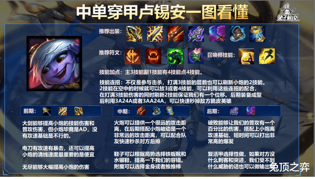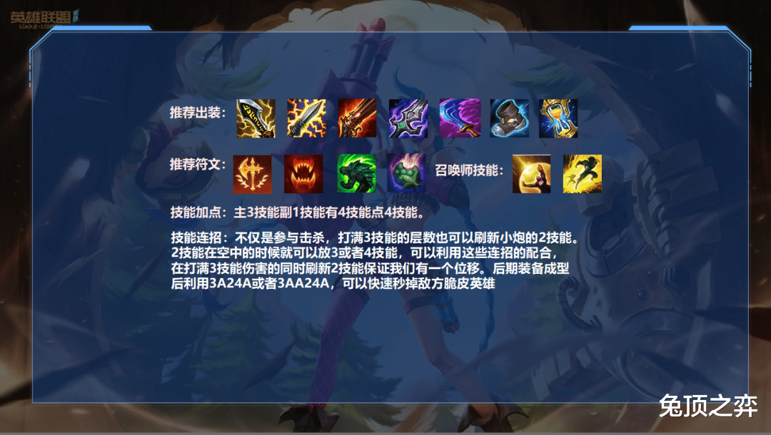不仅是参与击杀,打满3技能的层数也可以刷新小炮的2技能。2技能在空中的时候就可以放3或者4技能,可以利用这些连招的配合,在打满3技能伤害的同时刷新2技能保证我们有一个位移。后期装备成型后利用3A24A或者3AA24A,可以快速秒掉敌方脆皮英雄