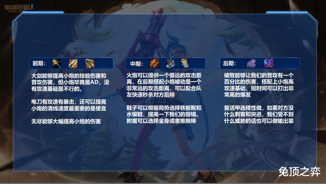 大剑+电刀过渡可以让小炮的技能、普攻伤害都有明显的提升,并且攻速、暴击和推线能力也会有很不错的提高,电刀最重要的一点就是属性面板不比其他暴击装差,还便宜很多钱,AOE的电刀效果还可以提高小炮的发育速度,之后我们可以补出无尽,这时候就是小炮的强势期了。