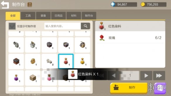 所有染料都是在制作台制作,一个红色染料需要由两个玫瑰制成。