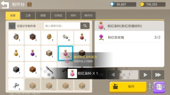 同样在制作台制作,用同样的办法把粉红色染料的种子放在家中或者奇异星球的耕地里,(新耕的地建议再旁边沟渠处用水桶灌入水哦!这样作物才会成长),等待片刻,最后收割就可以了。