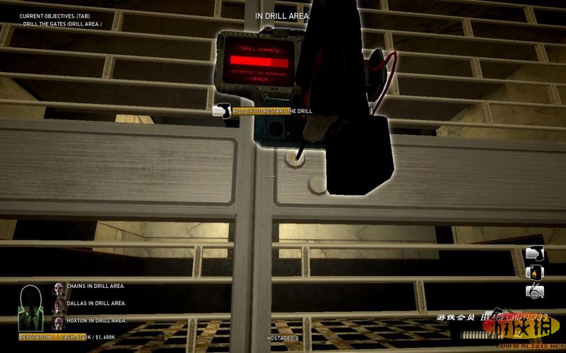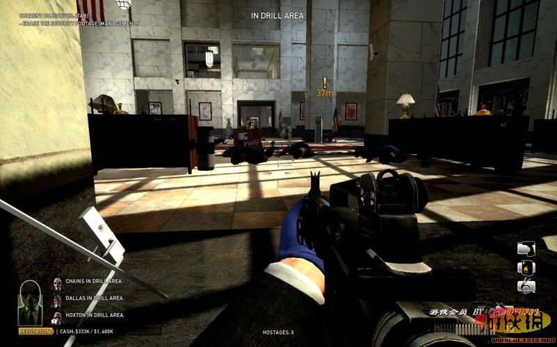 2:进去之后按F键开始打劫,先把里面的保安都杀了;等一会儿外面会来很多警察,边打边看周围的任务标示(一个黄色的标示,透过墙壁都能看到,仔细点观察);杀了银行管理员拿到钥匙后开门前去钻头处开启钻头,然后守住。