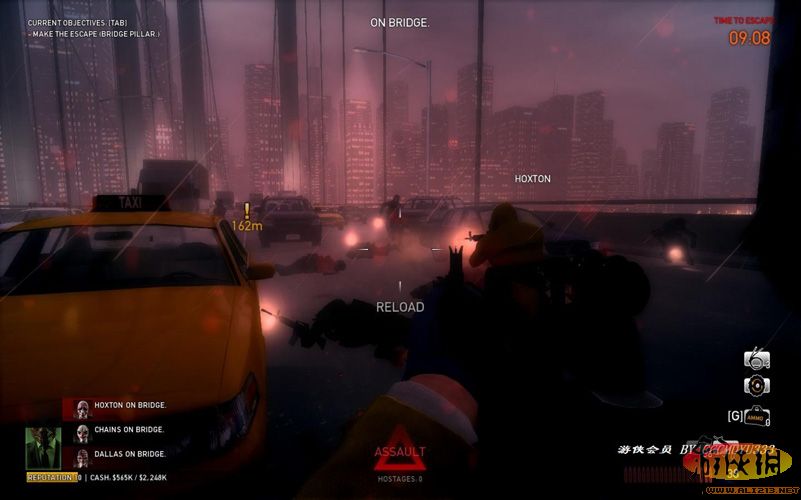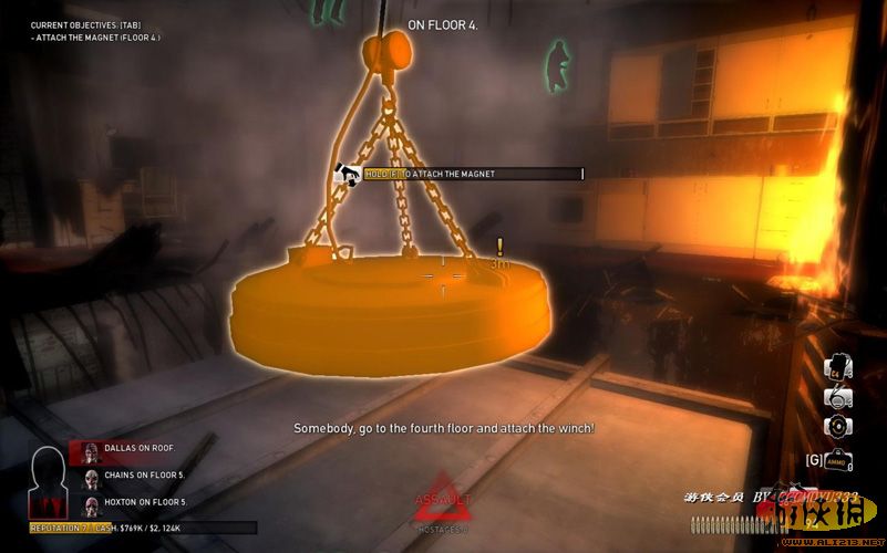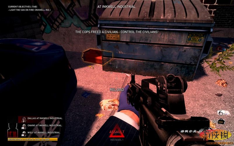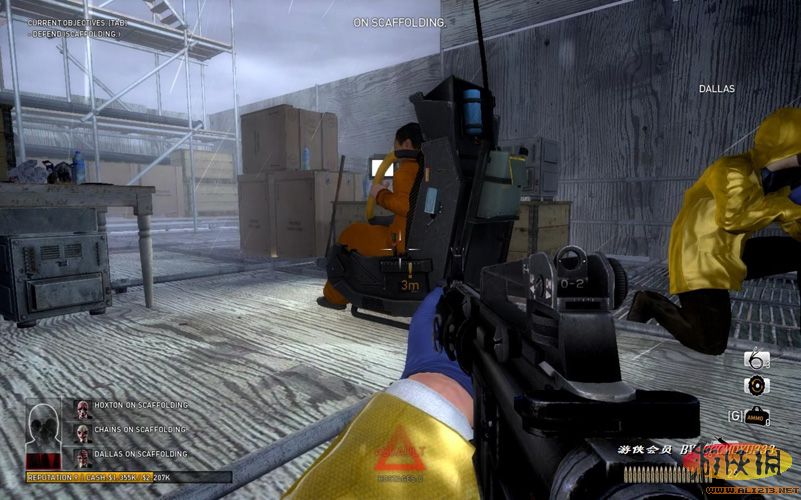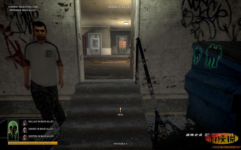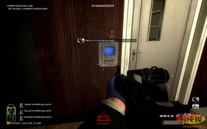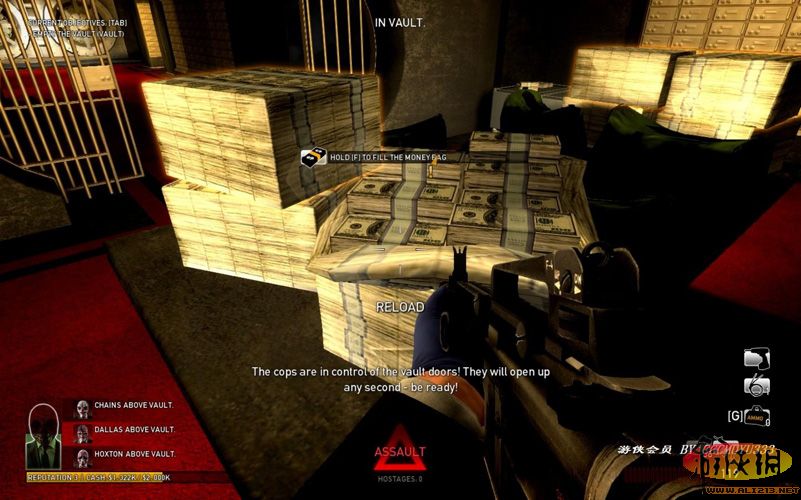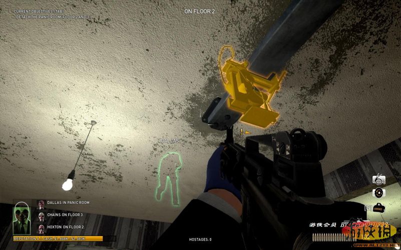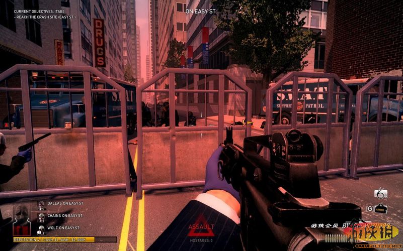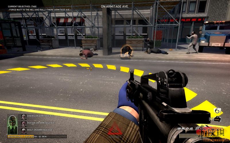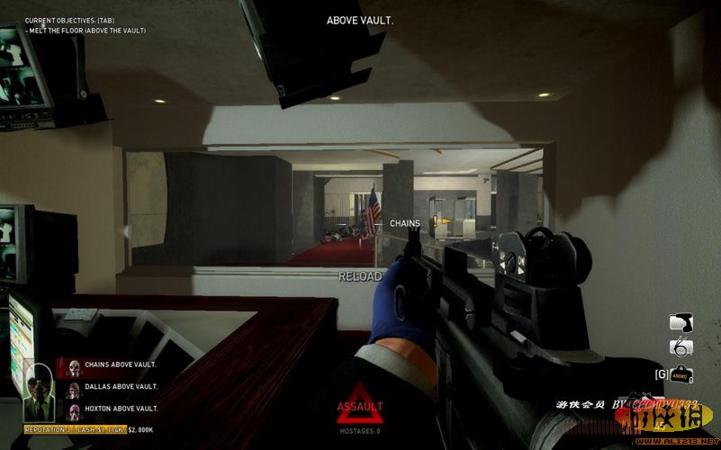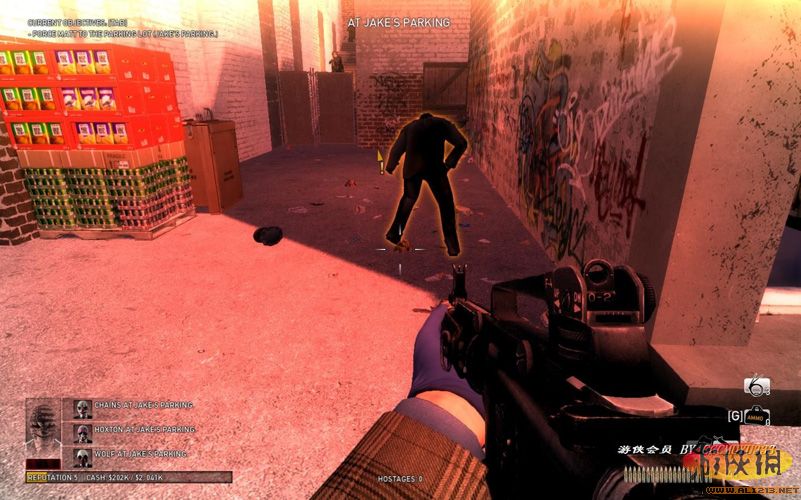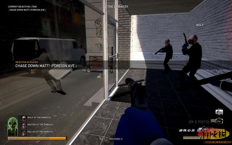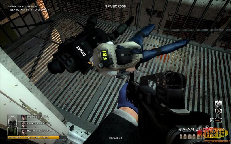 1:MATT(马特)竟然私自拿钱跑了,众面具男前去追捕。一路上很多的警察,越来越多,不过不要着急,慢慢打过去;不要远离队友,看准时机也可以冲过去自杀然后再队友复活你期间杀死几个敌人。(注意:按CTRL键蹲下时射击准星更准)