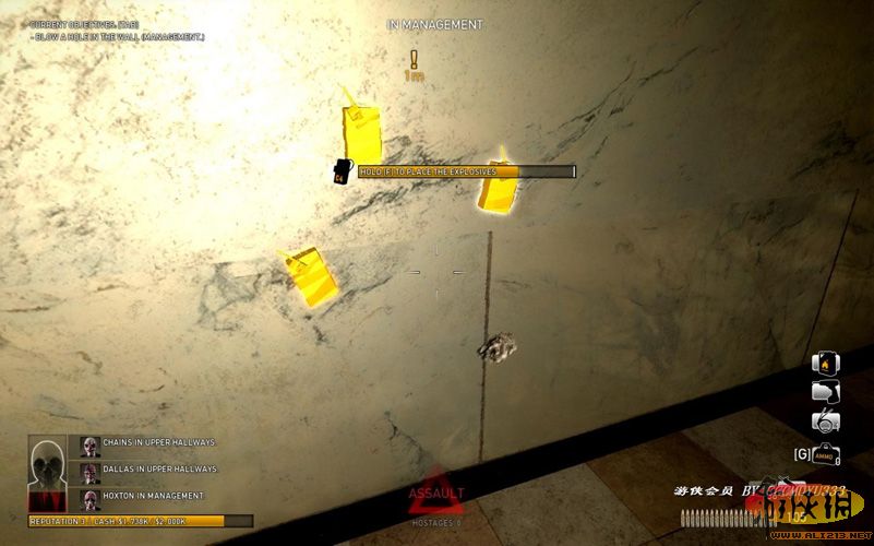 5:溶出一个大洞,跳进去之后装钱,把钱全部都装了之后撤离。按照提示来到一处墙壁,按F键开启定时炸弹炸开墙壁出去。