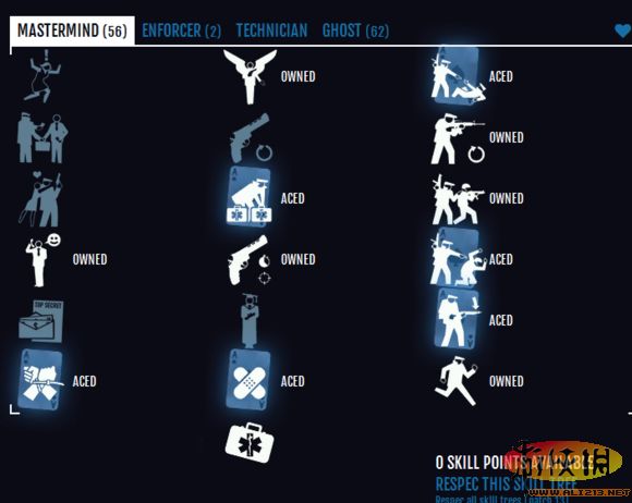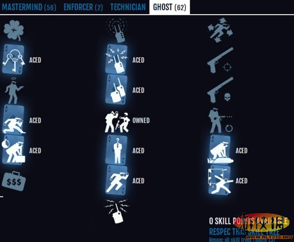 大家知道潜入所需要的技能点是并不多的,就算把潜入ECM加满也不需要很多点数。可以看到我在幽灵线和黑手线大致点了同样的点数。潜入的技能有一些是必须的:打包尸体,对讲机,恐吓(说服需要的时候不多,而且危险系数相当高)。为了方便快速,需要点出手开保险箱和ECM开门。#13更新之前,潜入银行的时候可以从后门溜进经理室拿门卡,#13的潜行系统改版之后就基本不可行了,这个是我亲身经历的,所以有的时候ECM开门甚至成了必须的东西。ECM延迟对讲机这东西点出了就可以在基友多的时候进行ECM rush,感觉还是很愉♂悦的。