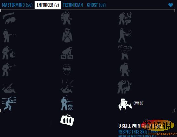 黑手的绑带、恐吓和对讲机点出之后,黑手线的潜入部分基本已经完成,多余的技能可以继续加,如图所示完全可以点出黑手的两个酷炫顶级技能:手枪救星和春哥吼,这样你在需要强推(鼠辈、纵火者等)的任务里也可以为团队做出贡献。顺路点出了双医疗包,那么你对队伍的贡献和一个纯黑手基本没有什么区别。