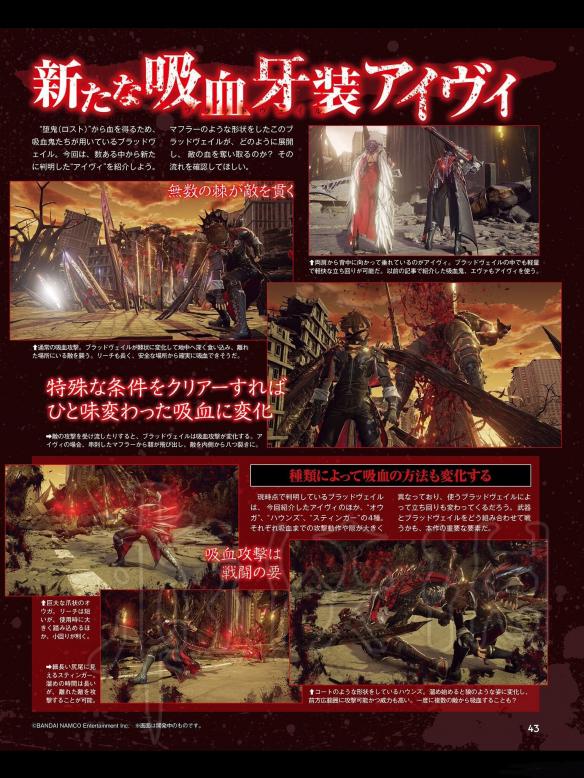 像是围巾一样的吸血牙装,普通的吸血攻击可以放出无数的荆棘刺向敌人。而挡开敌人的攻击时可以使串刺化的围巾飞出荆棘从敌人内部将之撕裂。