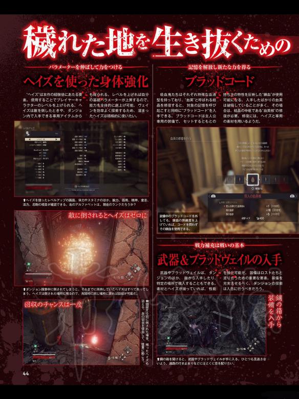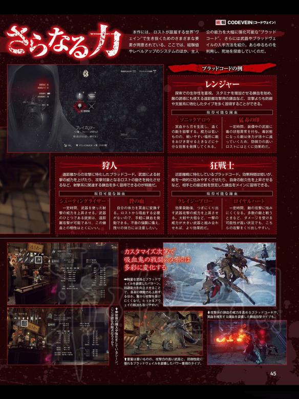 主角的专用装备。吸血鬼们都各自拥有特别的血型,将名为“血英”的结晶修复后就能唤醒对象的记忆并获得“血之代码”。装备这个“血之代码”就可以使用反映原本持有者特性的“炼血”。修复“血英”需要使用名为“血英核”的专用素材并耗费烟雾。血之代码有重视探索与生存能力的“游侠”、强化远距离攻击的“狩人”、强化近距离攻击的“狂战士”等等。