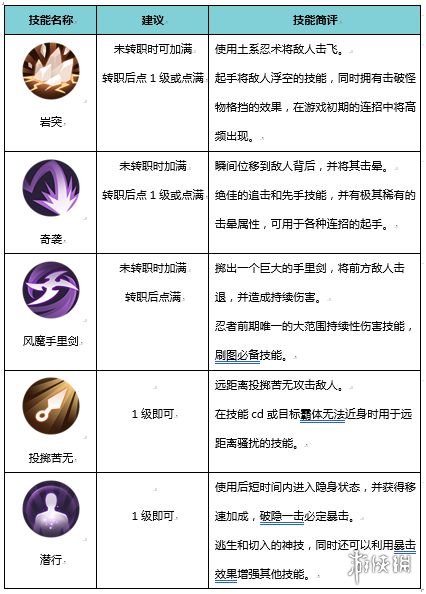 风魔手里剑是前期刷图必备技能,可造成大范围的持续伤害,并击退敌人,打群架少不了它。