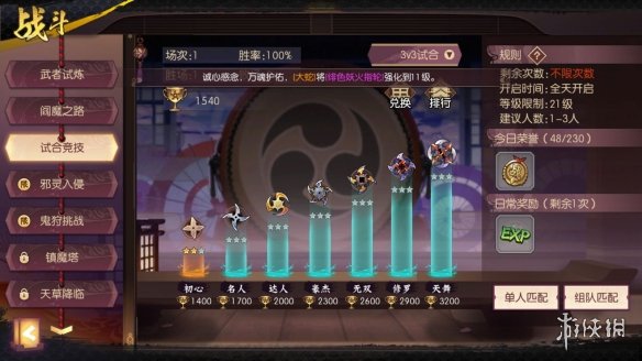 试合竞技采用积分制,当达到规定积分时,会给武者相应的段位名号。最低为1400分的初心,最高为3200分的天舞,总计7个段位级别。要成为最高的天舞竞技者,武者们还需要多多用心,越到后期,武者所匹配到大神的机会越大,要战胜了强力的对手并不容易。