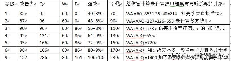 做个斩杀伤害表格五级前默认为一把长剑,加点顺序为WQEQQR(一级点W,无伤触发强攻消耗并后拉)之后主Q副W,E一级9级装备默认为幕刃一把。(2900金币算少的了)