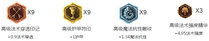 符文介绍:红色带固定的法术穿透符文,精华和其他的法师一样带3个高级法术强度,黄色全部堆固定护甲,蓝色堆固定魔抗。