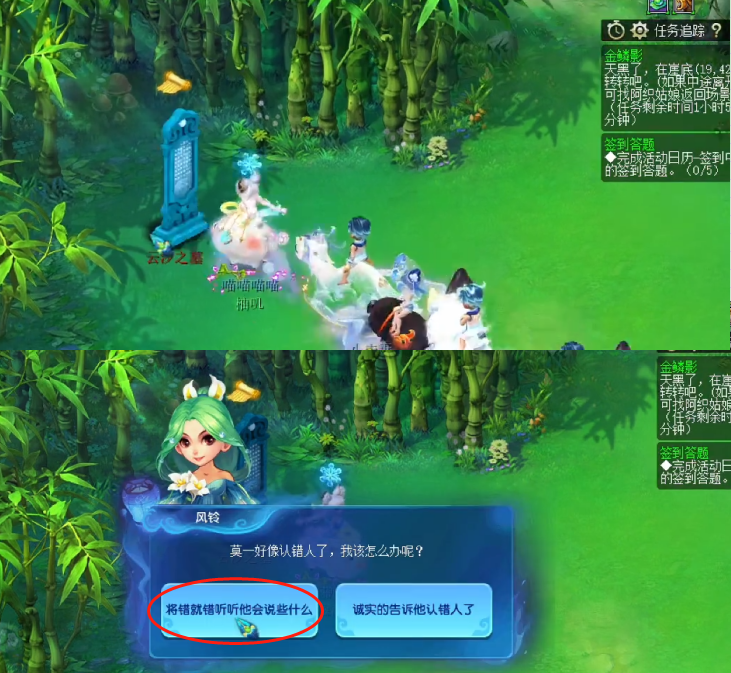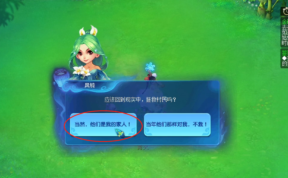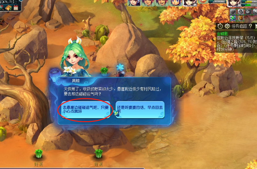 当野菜采集齐之后,会出现第1次选择题。切记:一定要选去悬崖边碰碰运气!如果系统提示你,选择得太快了,那就稍等几秒之后,再进行选择。千万不能选第2个选项,如果选第2个选项的话,你的金鳞影副本也会随之结束。