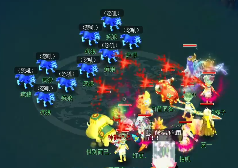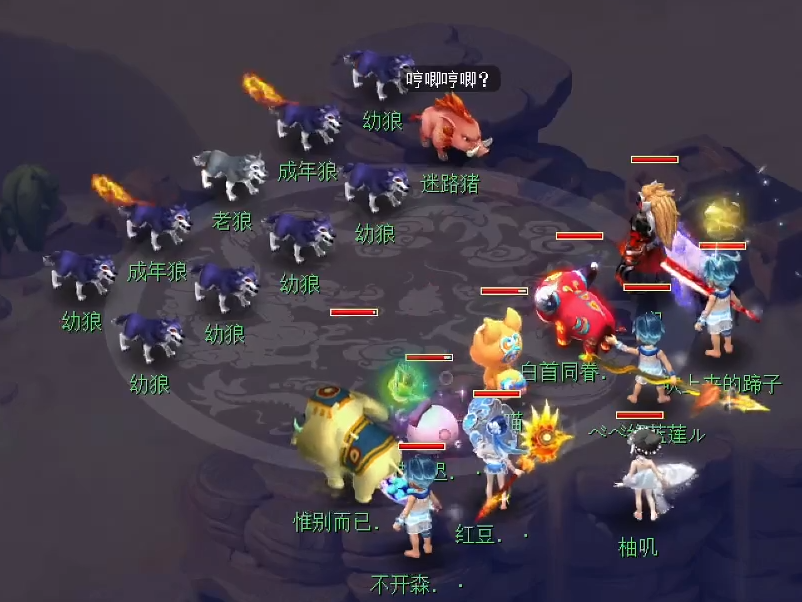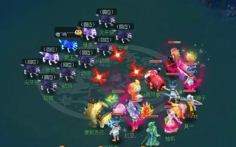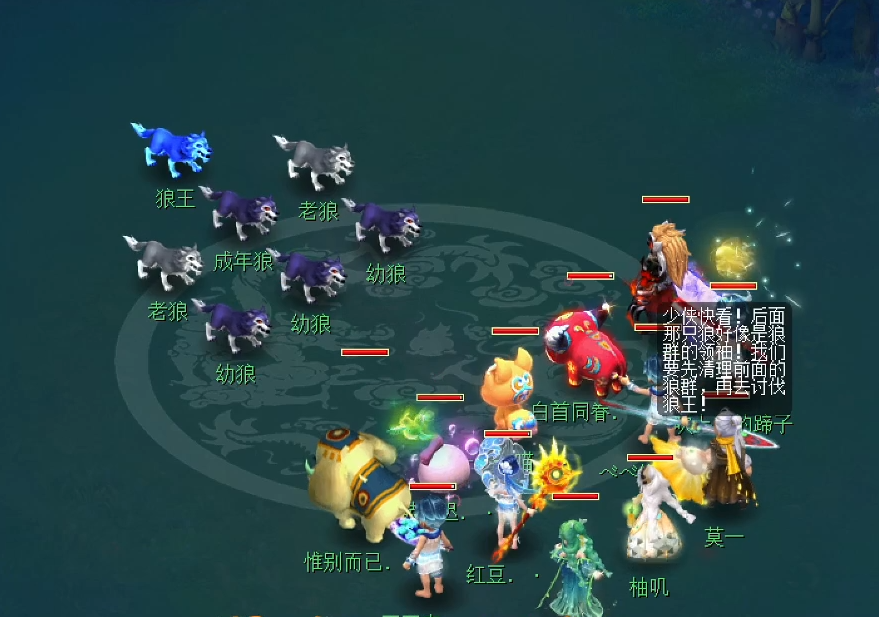 决战的战斗,一共分3个阶段。第1阶段,狼王不可被攻击!当前面的6个怪被击杀后,就可以开启第2阶段。建议:辅助系玩家可以直接起状态,为第2阶段的战斗做准备。