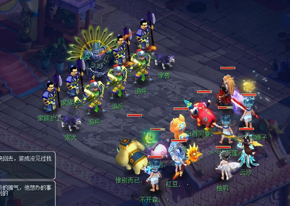 护卫队长,是五庄观。家族护卫,是法系。前排的追兵和家犬、家兽,都是物理系。不仅会门派技能,还会特技破血狂攻!建议:封印家犬、家兽,杀追兵。有特技罗汉金钟的玩家,一定要尽快使用。本场战斗有一定难度,不仅要注意血线,还要注意配合。