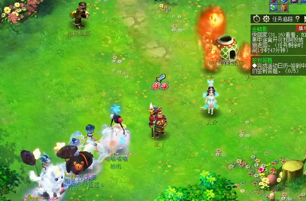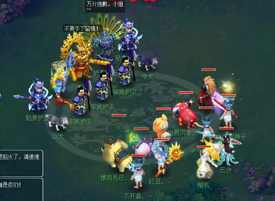 主怪,会秒10的地狱烈火!教头,是狮驼岭。护卫队长,是五庄观。贴身护卫,是法系。前排的家族护卫、公犬、母犬,都是物理系。建议:封印护卫队长、教头,击杀前排怪。在战斗过程中,云汐每个回合会给队伍中血量最低的单位释放命疗术。