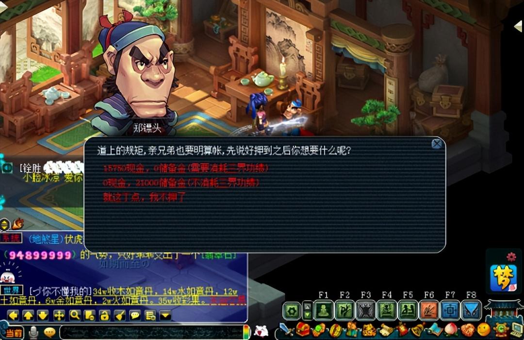 刷完了师门、钓了三个小时的鱼,也弄好了牧场以及庭院,那么接下来就去押镖吧!押镖能够获得海量的储备金,而且战斗也简单。每天押完50个镖,能够获得100W(三级镖)的储备金,一个月就是3000W。押镖可以说是五开前期最重要的养号方式,有了这些储备金,才能点修、点技能去变强。