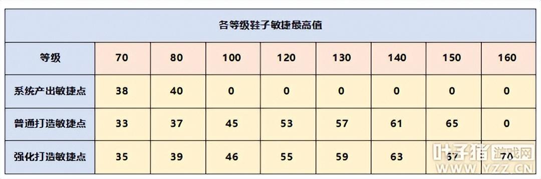 其次,人物的速度属性和鞋子附加的敏捷值也有关系。60-80级装备可以系统产出,其产出值较打造值高,100-150鞋子可以通过普通、强化打造获得,160级只能通过强化打造获得。