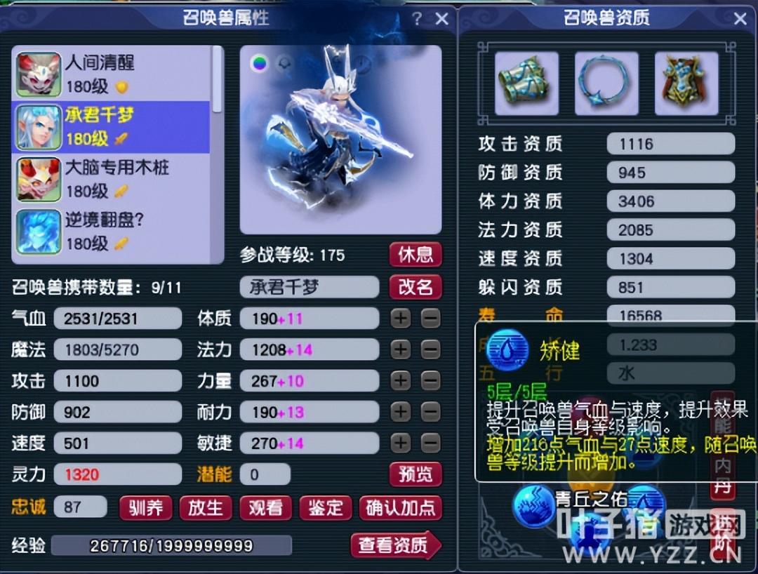 除此之外,召唤兽内丹、心得技能也可以提升一定的速度属性。如果你的须弥内丹足够多,你可以选择矫健、迅敏等内丹来提升速度,山河画卷中也有提升召唤兽敏捷属性的技能,比如青丘之佑(人物达到化圣,通关一次青丘迷雾副本即可解锁)。