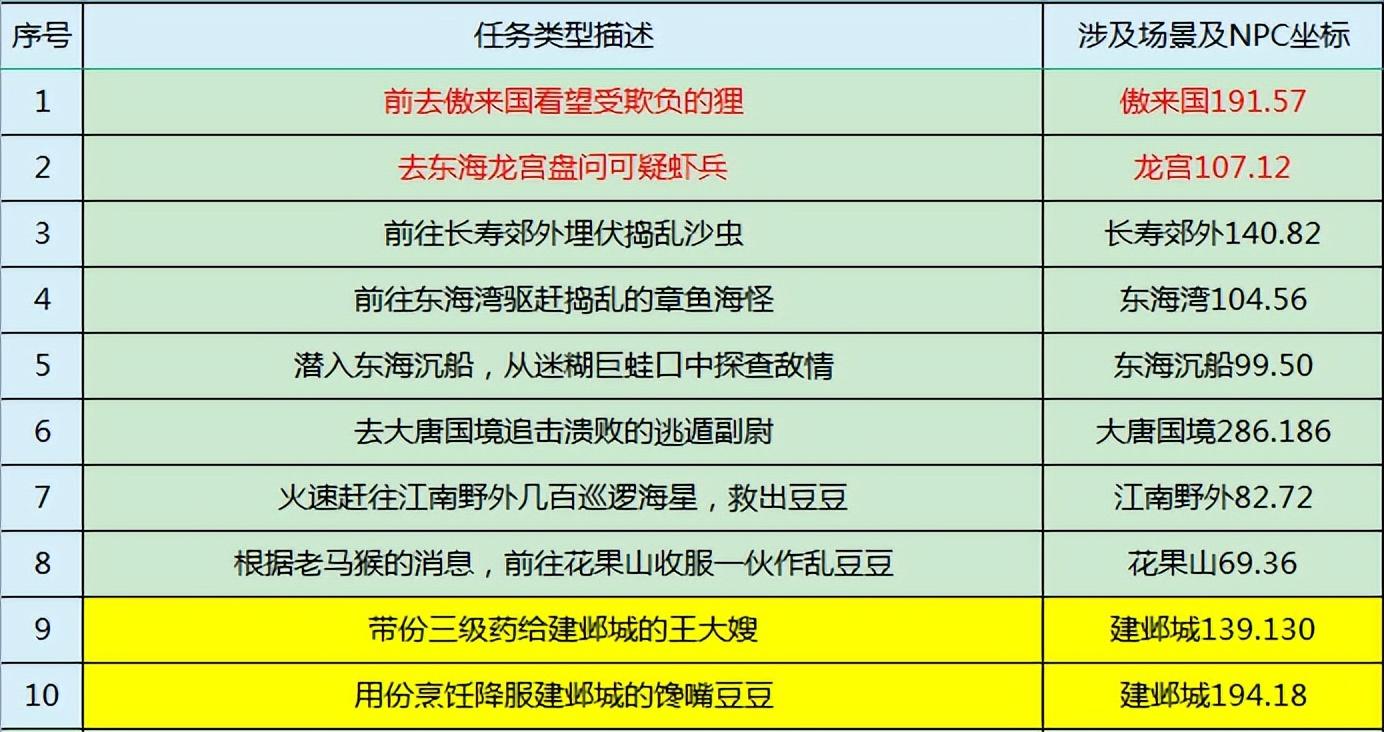 本次任务,一共有10种任务类型。其中,红色字体标注的傲来国和东海龙宫这两场战斗有朽木翁!