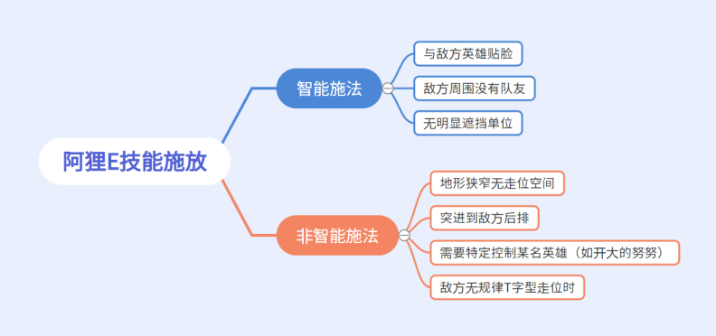 在介绍技能之前,我们先来谈谈手游的机制,相信80%的玩家在玩阿狸时都采用的智能施法,在某些情况下智能施法的命中率的确不错,但切记不可过于依赖,那么什么时候该使用智能施法,什么时候又该手动操作呢?为大家做了一个思维导图,感兴趣的朋友可以学习一下。