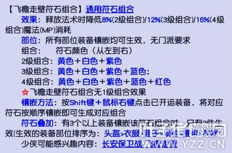 另外,可以镶嵌飞檐走壁的方式来降低蓝耗。选用二级组合可以降低8%、三级组合可以降低12%、四级组合可以降低16%,最多生效两件,效果可叠加。