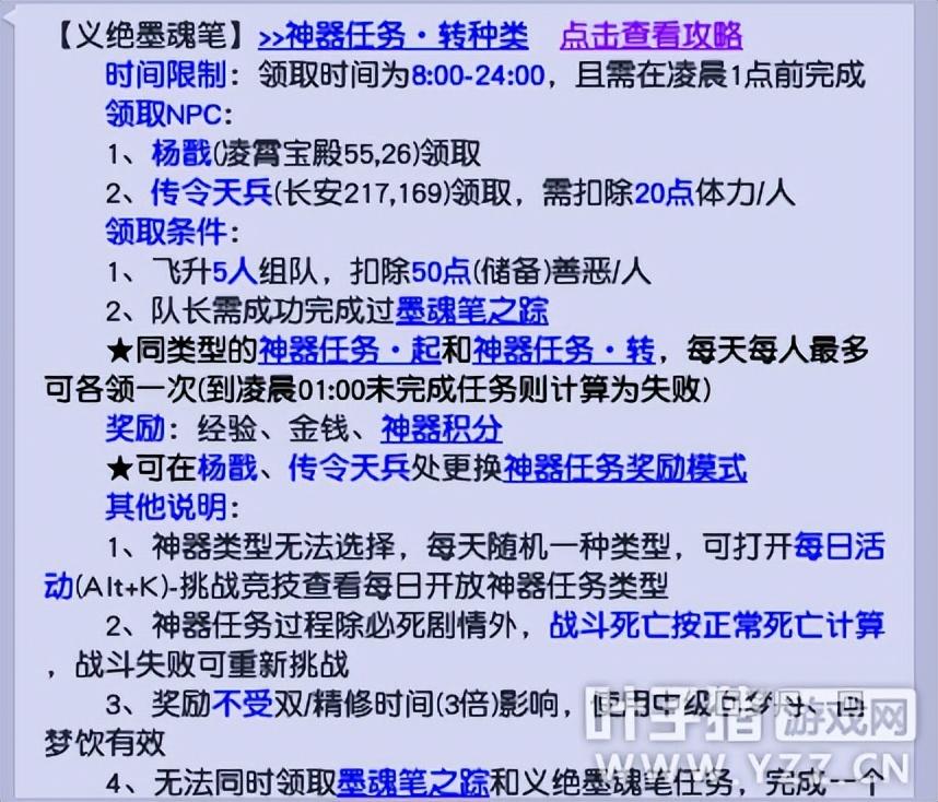 领取条件:飞升5人组队,需50点(储备)善恶/人,且队长需成功完成过墨魂笔之踪★同类型的神器任务·起和神器任务·转,每天每人最多可各领一次(到凌晨01:00未完成任务则计算为失败)。