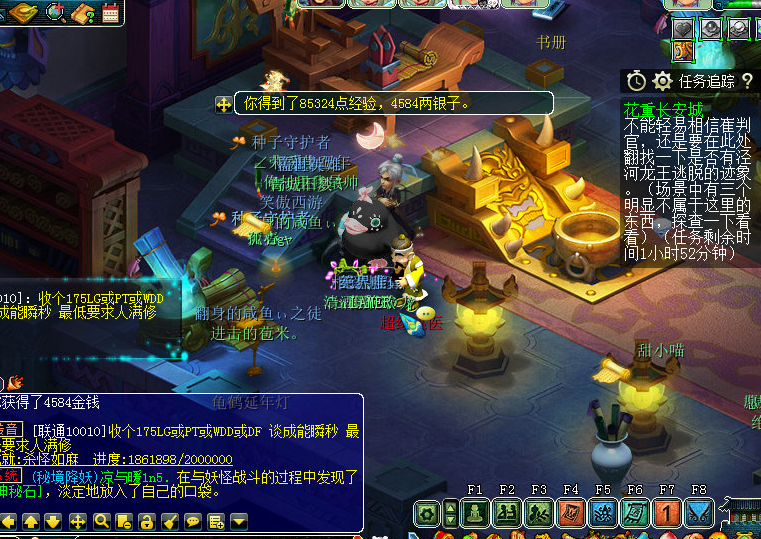 战斗胜利后,在场景内找到龟鹤延年灯、书册、与瓷花瓶,调查是否有泾河龙王逃脱的迹象。