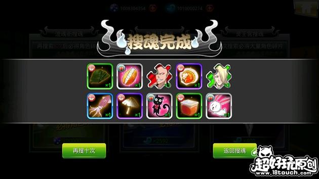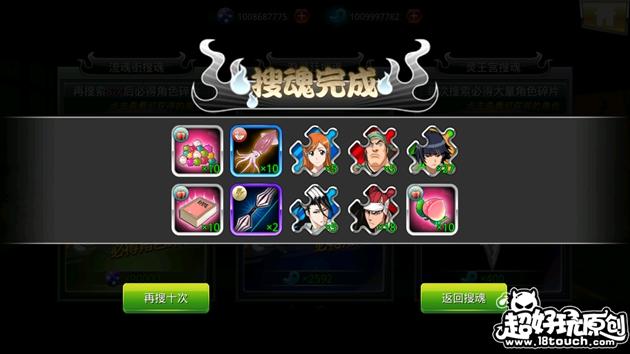7、瀞灵廷搜魂,如果魂玉足够的话可以十连,消耗2593魂玉,获得的材料比较好,有交往材料、武器之灵和碎片,并必得角色。